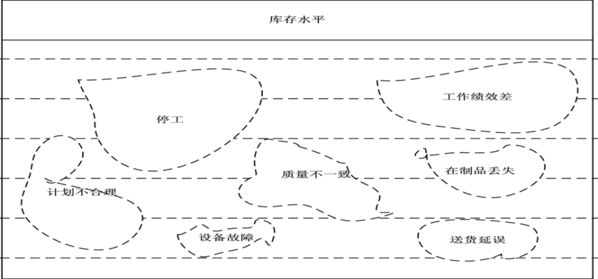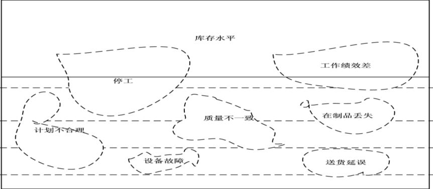 高庫存掩蓋管理的問題就如同小溪中的水淹過河底中的石頭一樣,許多問題就隱藏在庫存中很難發現。降低庫存水平,就像降低水位一樣就暴露出問題。